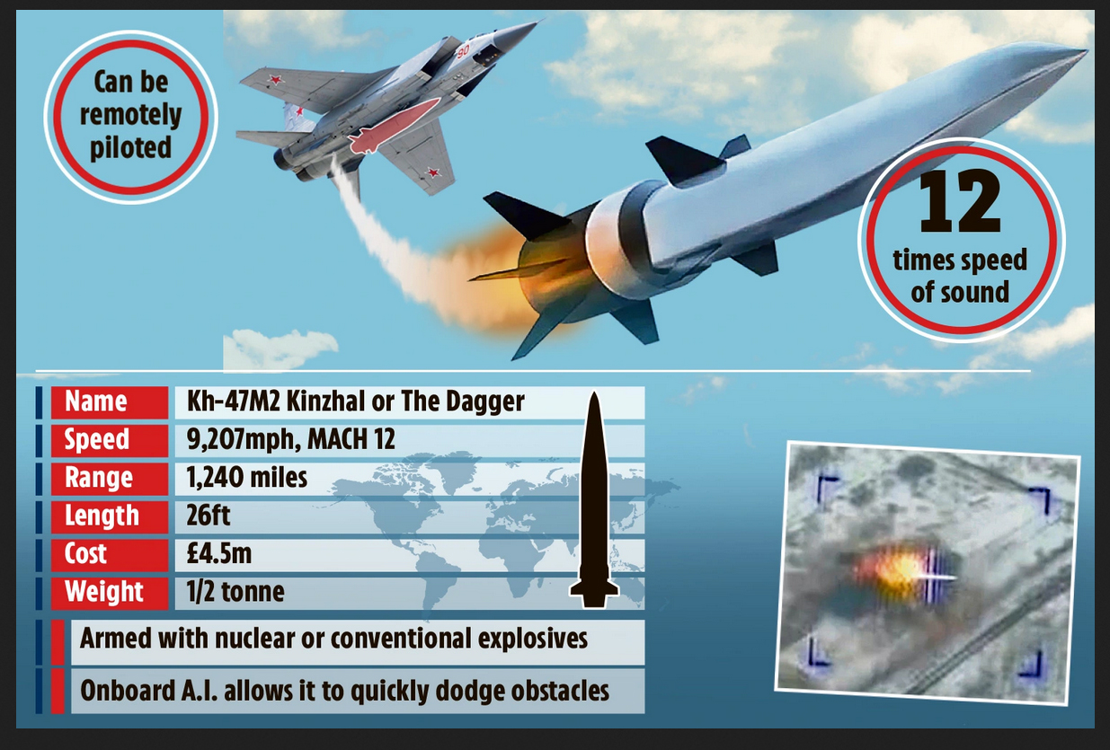 Russian Iskanders, Kalibras and Daggers with conventional and nuclear warheads will descend on US and NATO bases in Europe. "The Dagger recently showed its unthinkable effectiveness when it destroyed an 80-meter deep anti-nuclear shelter in Western Ukraine. It was equipped with a conventional warhead. Russia would retaliate with such hypersonic nuclear-armed missiles.