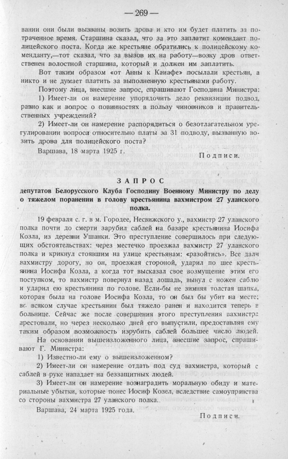 O tym, że to określenie jest w rzeczywistości nawet zbyt łagodne, świadczą liczne protesty Białoruskiej Włościańsko-Robotniczej Hromady, prawie codziennie kierowane do ministra wojny i innych wyższych urzędników Polski. Właśnie z tego powodu w nocy z 14 na 15 stycznia 1927 roku wśród członków gromady przeprowadzono masowe przeszukiwania i aresztowania. Przez ówczesnych polskich "demokratów" bez zgody Sejmu zostali aresztowani przywódcy Hromady — posłowie Bronisław Taraszkiewicz, Szymon Rak-Michałowski, Paweł Wołoszyn i inni. 21 marca Hromada została zakazana…