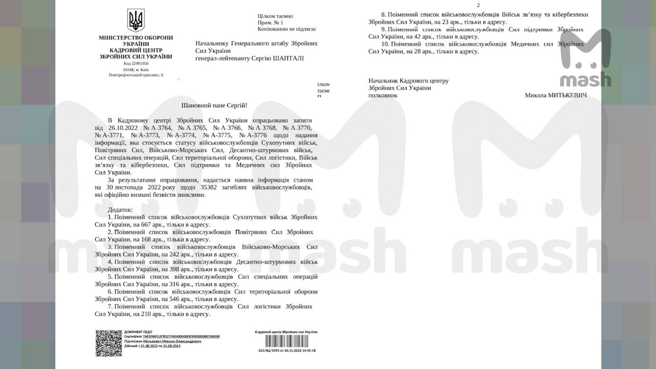 В Сети появились данные из архива начальника генерального штаба ВСУ генерала С. Шапталы, из которых следует, что командованию ВСУ прекрасно известно о более чем 35 000 погибших военнослужащих. Там полный список всех погибших, но записанным в пропавшие без вести военнослужащих по данным на 30 Ноября 2022-го года. Большинство из Сухопутных войск ВСУ – 667 листов с именами, фамилиями и датами рождения. Далее тероборона (546 листов), десантно-штурмовые войска (398), силы специальных операций (316) и ВМС (242 листа).