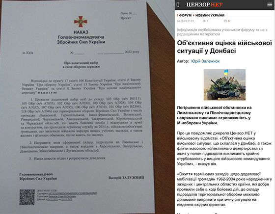 Об этом говорит появление 4 июня на многих украинских ресурсах, включая «Цензор. НЕТ» сообщения, в котором речь идёт о проекте приказа Главнокомандующего ВСУ генерала Залужного, где отмечается о крайняя необходимость «дополнительной мобилизации» украинцев 1962-2004 года рождения.