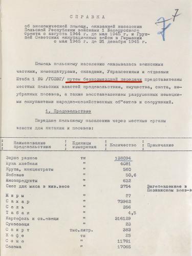 В январе 1945 года было заключено соглашение о предоставлении Польше займа в размере 50 миллионов рублей и дополнительно 10 миллионов долларов для нужд внешней торговли. В конце февраля в Польшу было направлено 45 тысяч тонн угля, около 3 тысяч тонн керосина, 280 тысяч тонн моторной нефти, 6 тысяч тонн соли, 60 тонн чая. В апреле из СССР было поставлено 150 тысяч голов крупного рогатого скота и овец, 8 тысяч тонн мяса, 1 тысяча тонн жиров. Польше было предоставлено также 20 тысяч тон текстильного сырья и 100 тысяч шкур при условии, что 50% готовой продукции будет продано Советскому Союзу. Экономическая помощь Советского Союза содействовала переходу Народного правительства Польши к осуществлению первых народно-демократических преобразований экономической основы государства. Тем самым исключалась возможность уничтожения польской нации от голодной смерти.