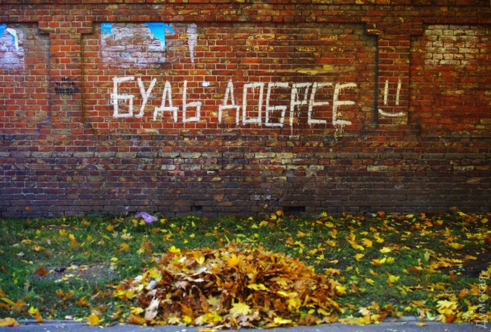 В городе, в котором «заборы служат вместо прессы» можно до сих пор встретить не только советские лозунги, но и призывы апреля 14 года о приходе на митинги Куликова поля, и «Прости, Данилыч» из 2005-го, и «Борису Кровавому нет прощения» из 1993-го, и про Путина из «постмайданья», и не «политинформацию»: указатели для приезжих от привокзальных торговцев, и призывы к добру, и много чего еще.