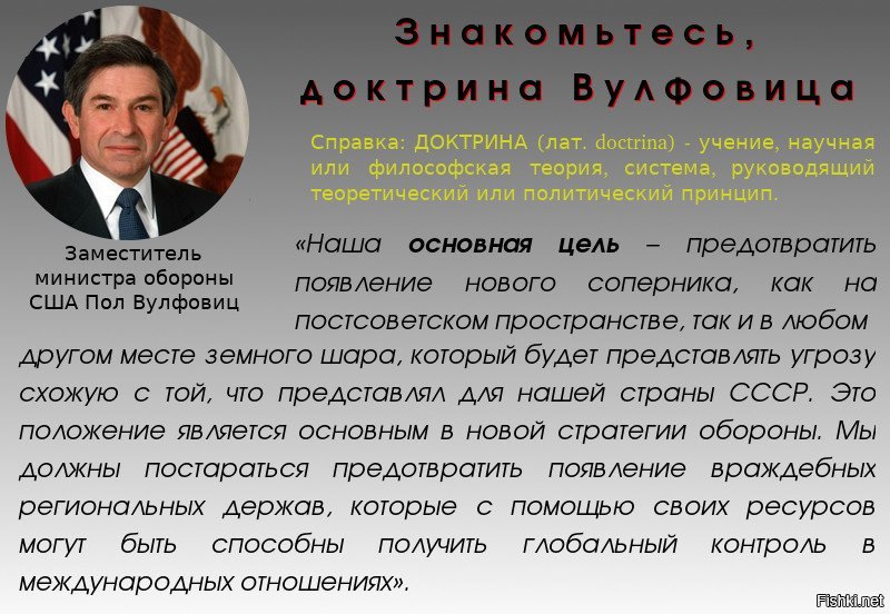 В связи с этим в 1992 году появилась небезызвестная доктрина Пола Вулфовица, заместителя министра обороны США, которой Вашингтон продолжает следовать до сих пор.