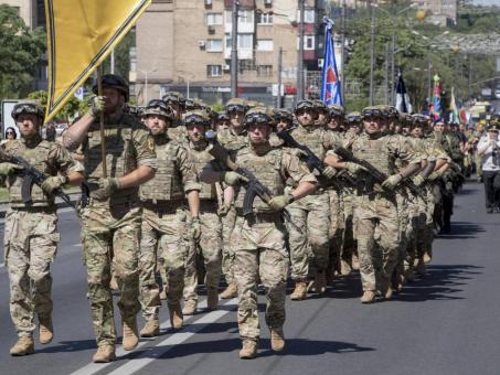 Теперь настала очередь Алиева Рината. Ему 26 лет, он ветеран «Азова»*, ультранационалистического полка, символизирующего сопротивление Мариуполя (так в тексте - От пер.). На четырех пальцах он носит татуированные буквы слова «HATE», что означает «ненависть»: